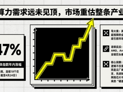 近期,全球芯片市场再度掀起热潮,费城半导体指数在4月24日创下历史新高,连续18个交易日上涨,年内涨幅突破47%。这一波行情的直接推手是英特尔发布的超预期业绩指引,市场由此意识到,人工智能(AI)驱动的算力需求远未达到顶点。当日,英特尔股价大幅上扬,AMD、Arm和英伟达等公司股价也随之攀升。